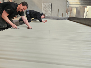 Met een flinke dosis vakmanschap én een brede glimlach leggen Vinnie en Koen de laatste hand aan de bekistingsvorm met Friesland-profilering.